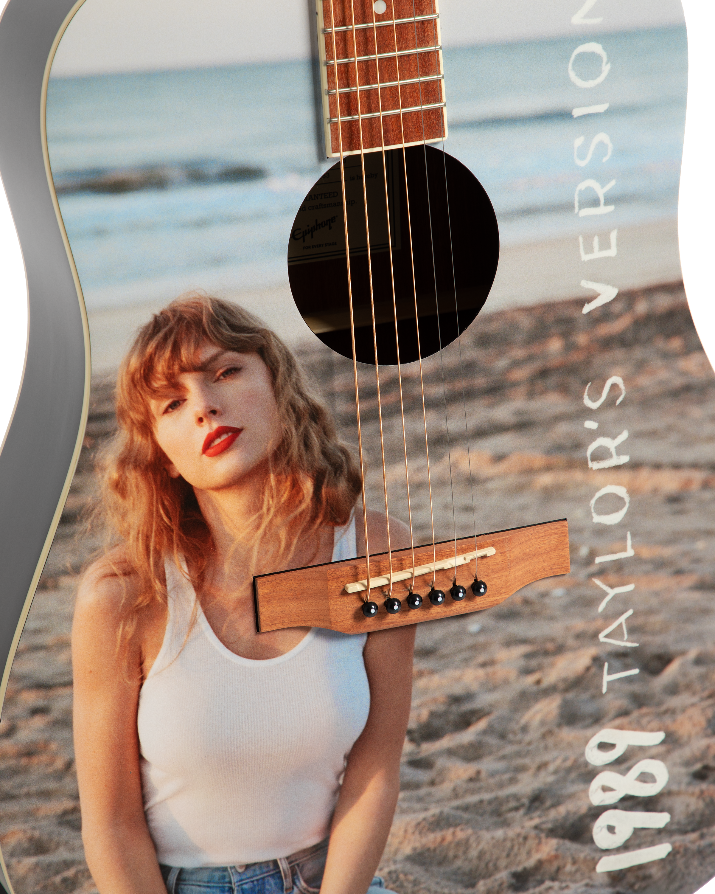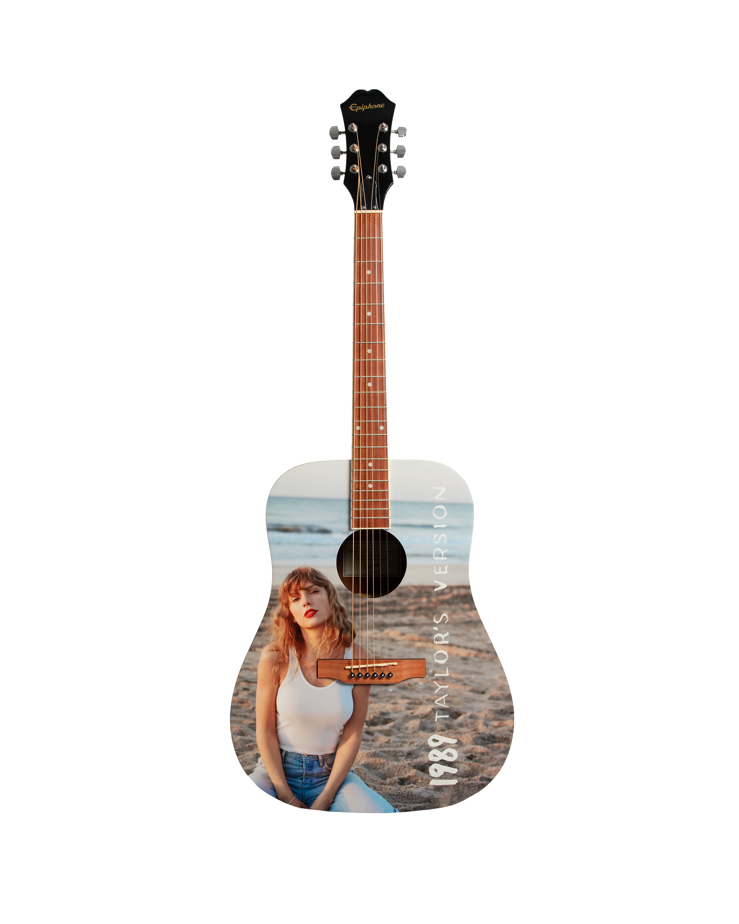Acoustic Epiphone DR-100 guitar with custom-designed 1989 (Taylor’s Version) album photo of Taylor Swift and 1989 Taylor’s Version printed on front. Each guitar comes with a unique serial number printed on the back of the guitar headstock to identify this collectible product.
