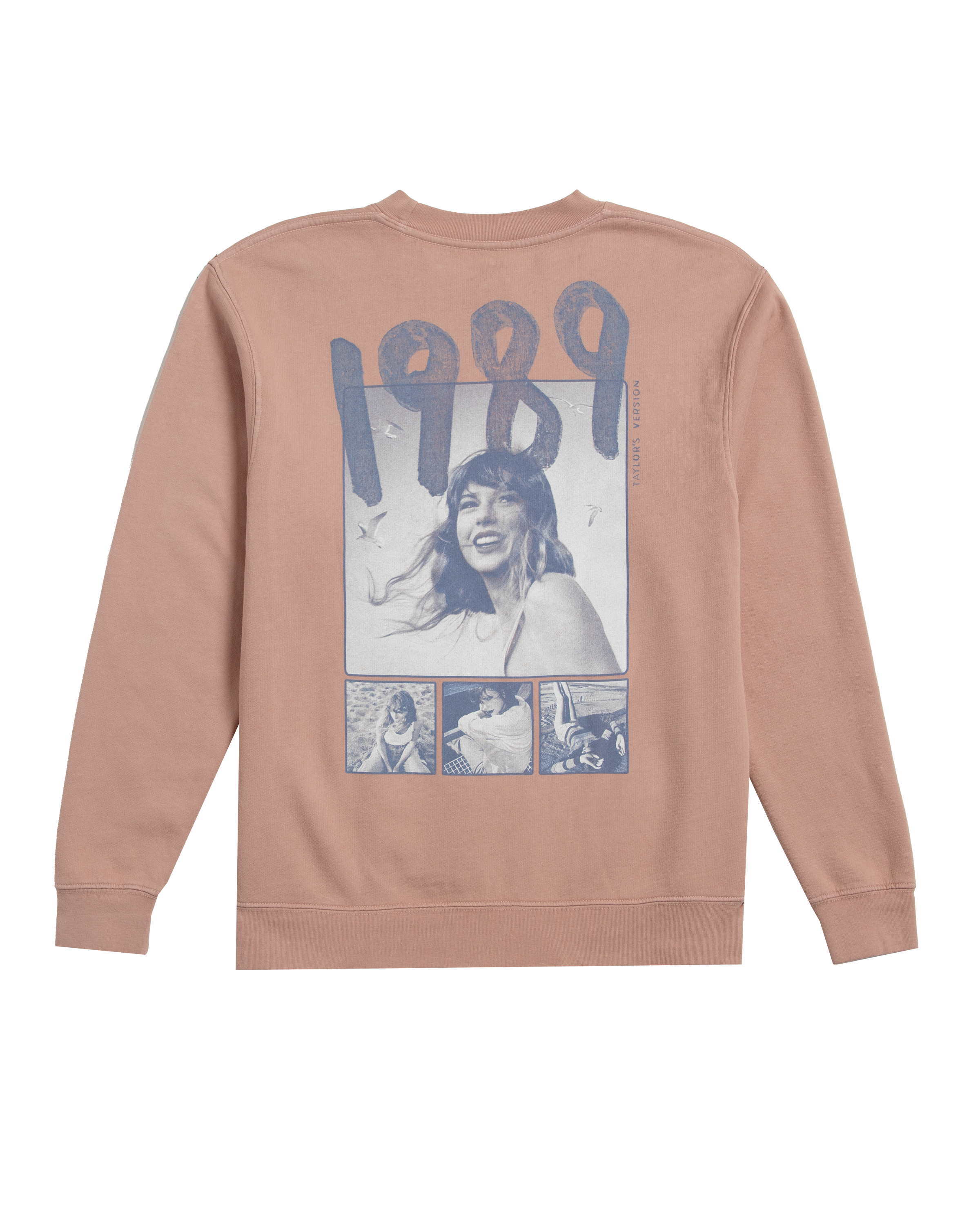 Pink crewneck featuring Taylor Swift printed on front and 1989 (Taylor’s Version) photos with 1989 Taylor’s Version printed on back.