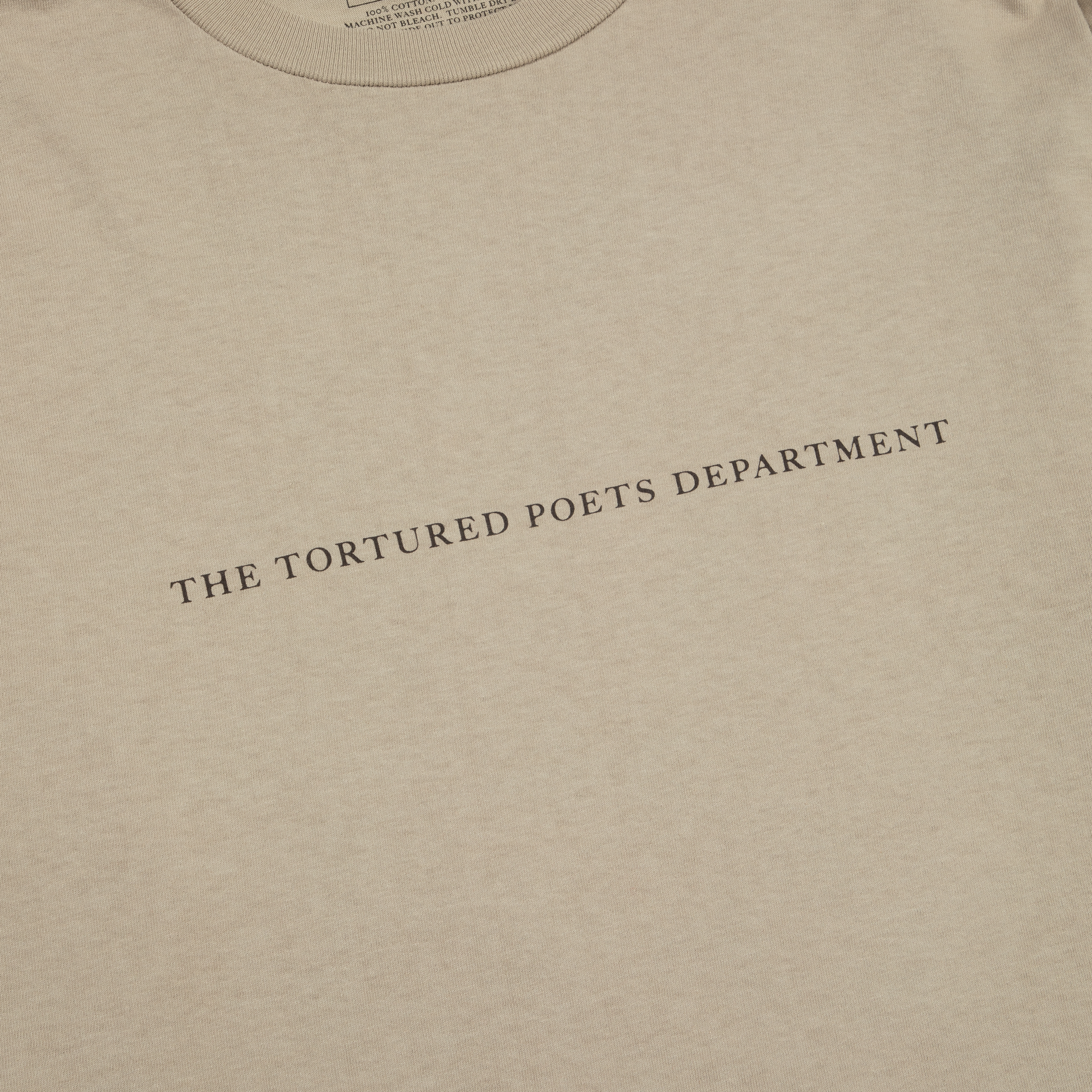 Beige long sleeve t-shirt featuring The Tortured Poets Department printed on front and But Daddy I Love Him song lyrics. I’ll Tell You Something About My Good Name It’s Mine Alone To Disgrace song lyrics. Taylor Swift. TTPD album logo. and ©2024 printed on back.