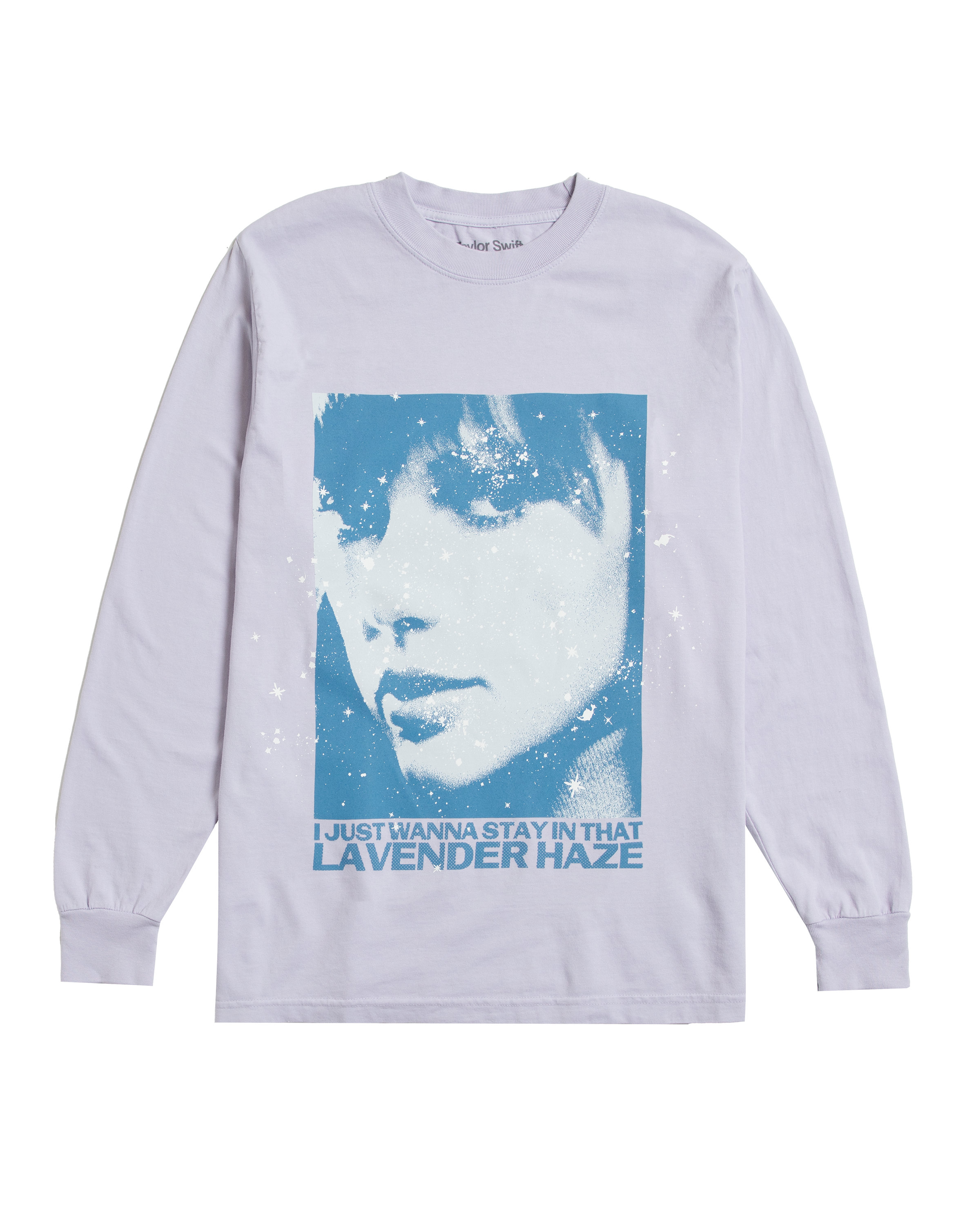Lavender long sleeve t-shirt featuring Taylor Swift Midnights album artwork and I just wanna stay in that lavender haze song lyrics and twinkle design printed on front.