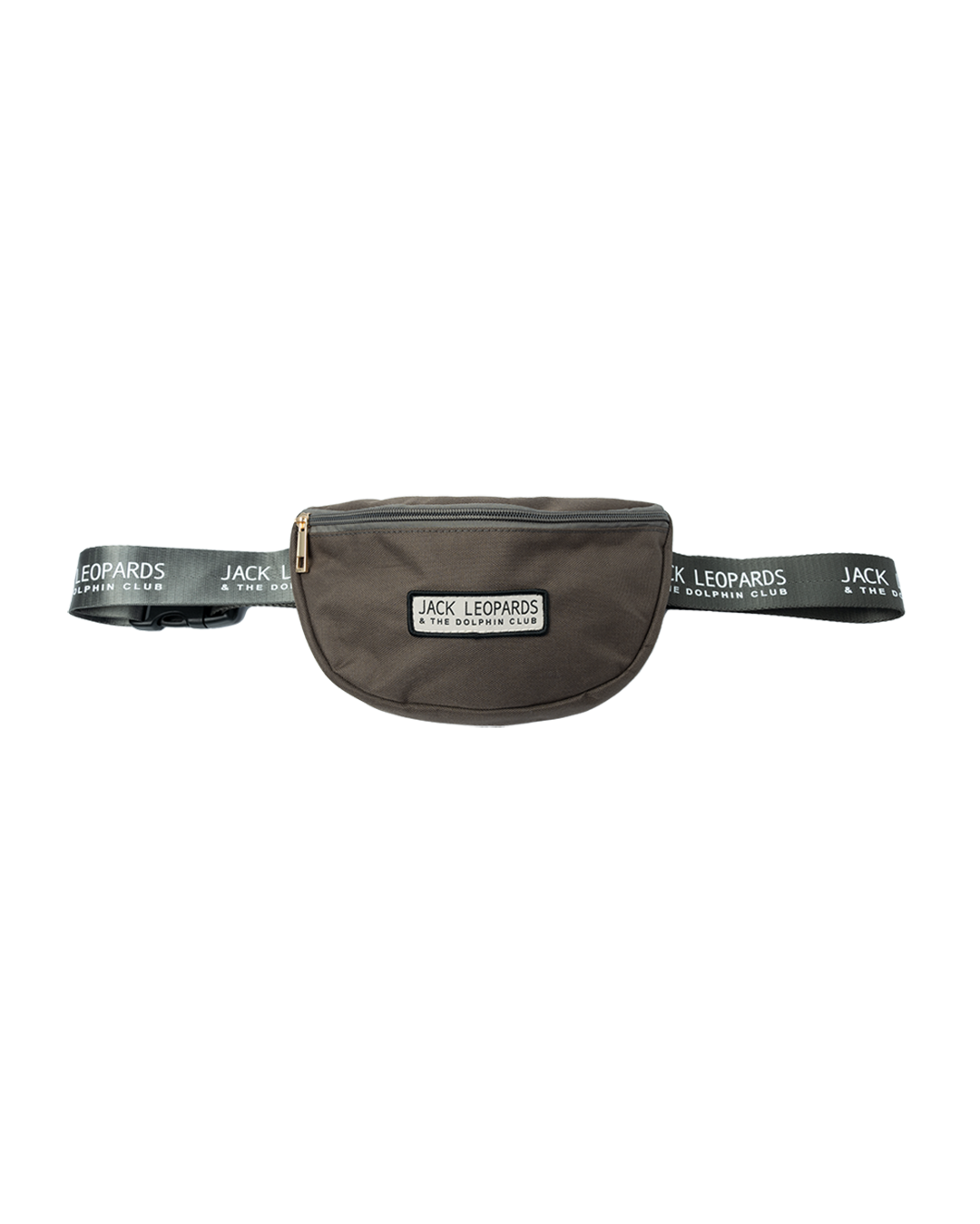 Brown zipper hip bag featuring Jack Leopards & The Dolphin Club embroidered on front woven label with Jack Leopards & The Dolphin Club repeating logo printed on adjustable strap with buckle closure.