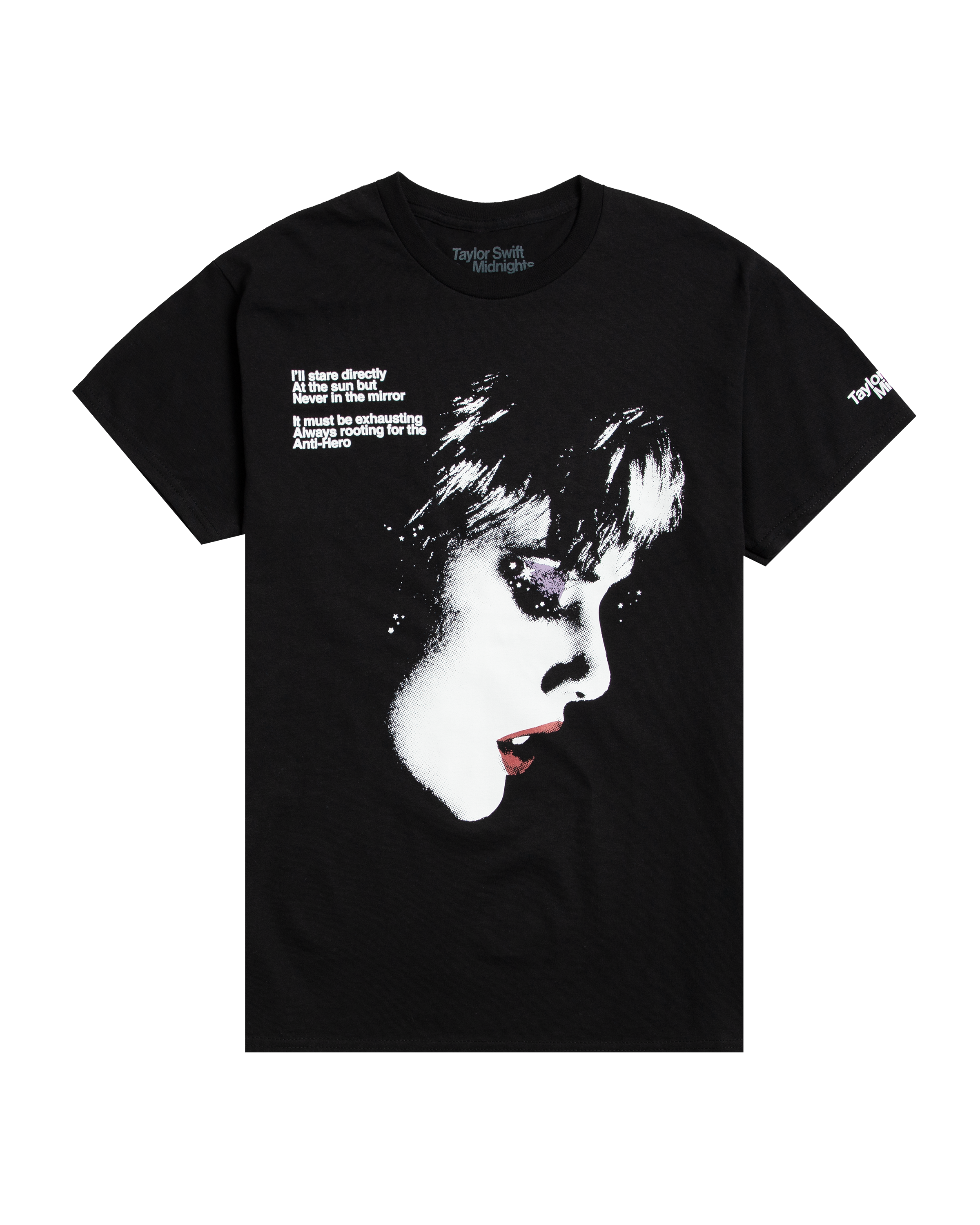 Black t-shirt featuring Taylor Swift Midnights photo and I’ll stare directly At the sun but Never in the mirror It must have been exhausting Always rooting for the Anti-hero song lyrics and twinkle design printed on front and Taylor Swift Midnights printed on wearer’s left sleeve.