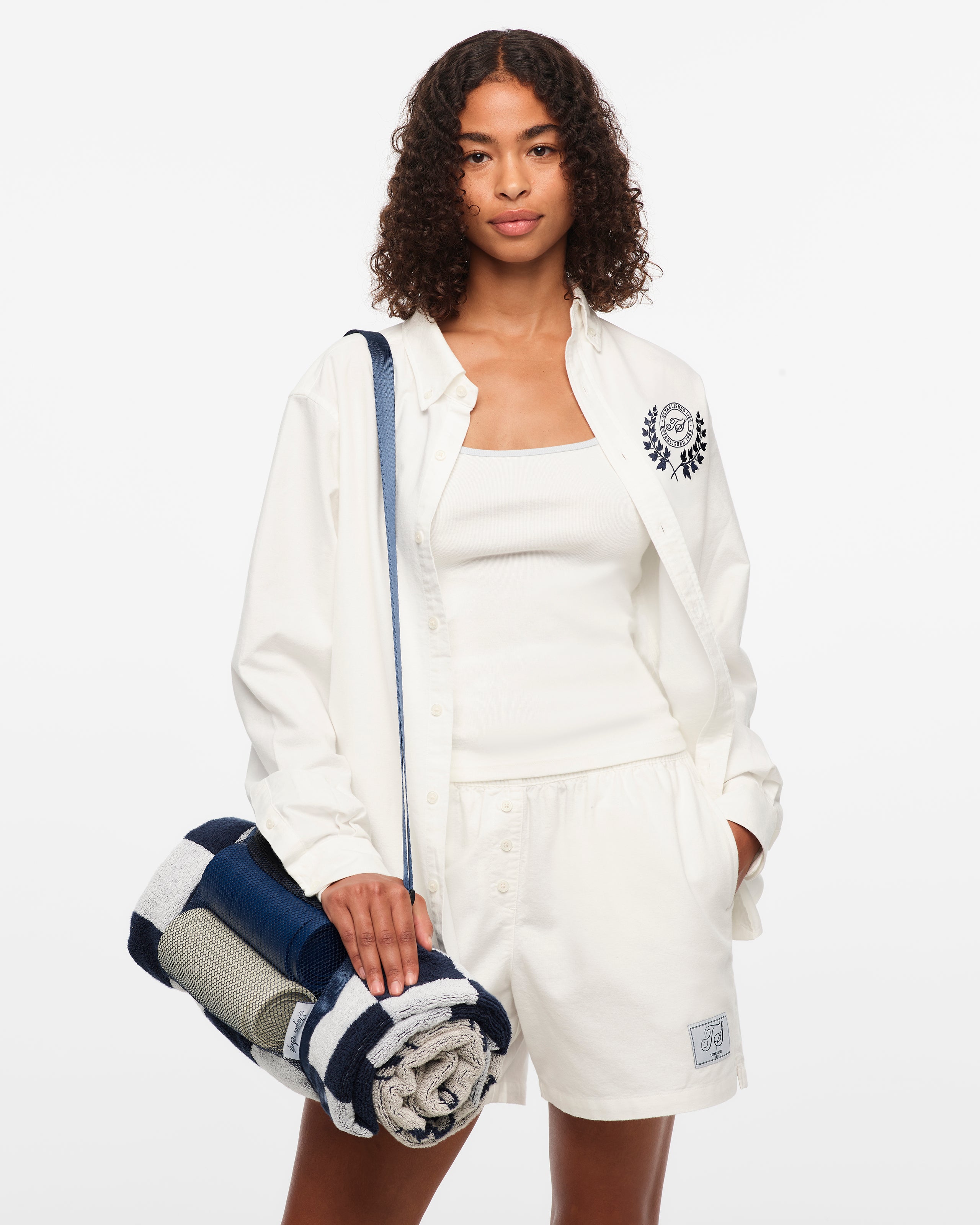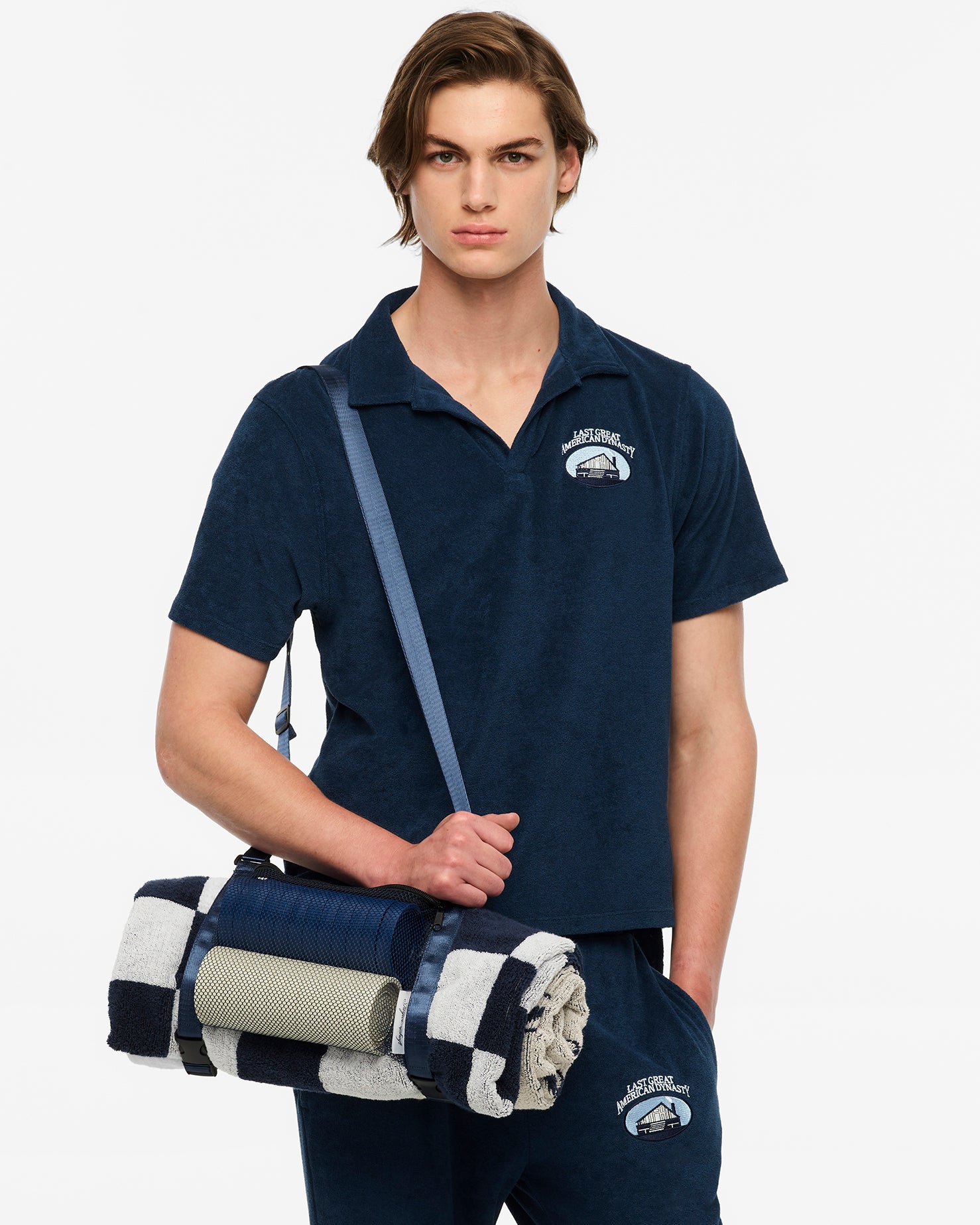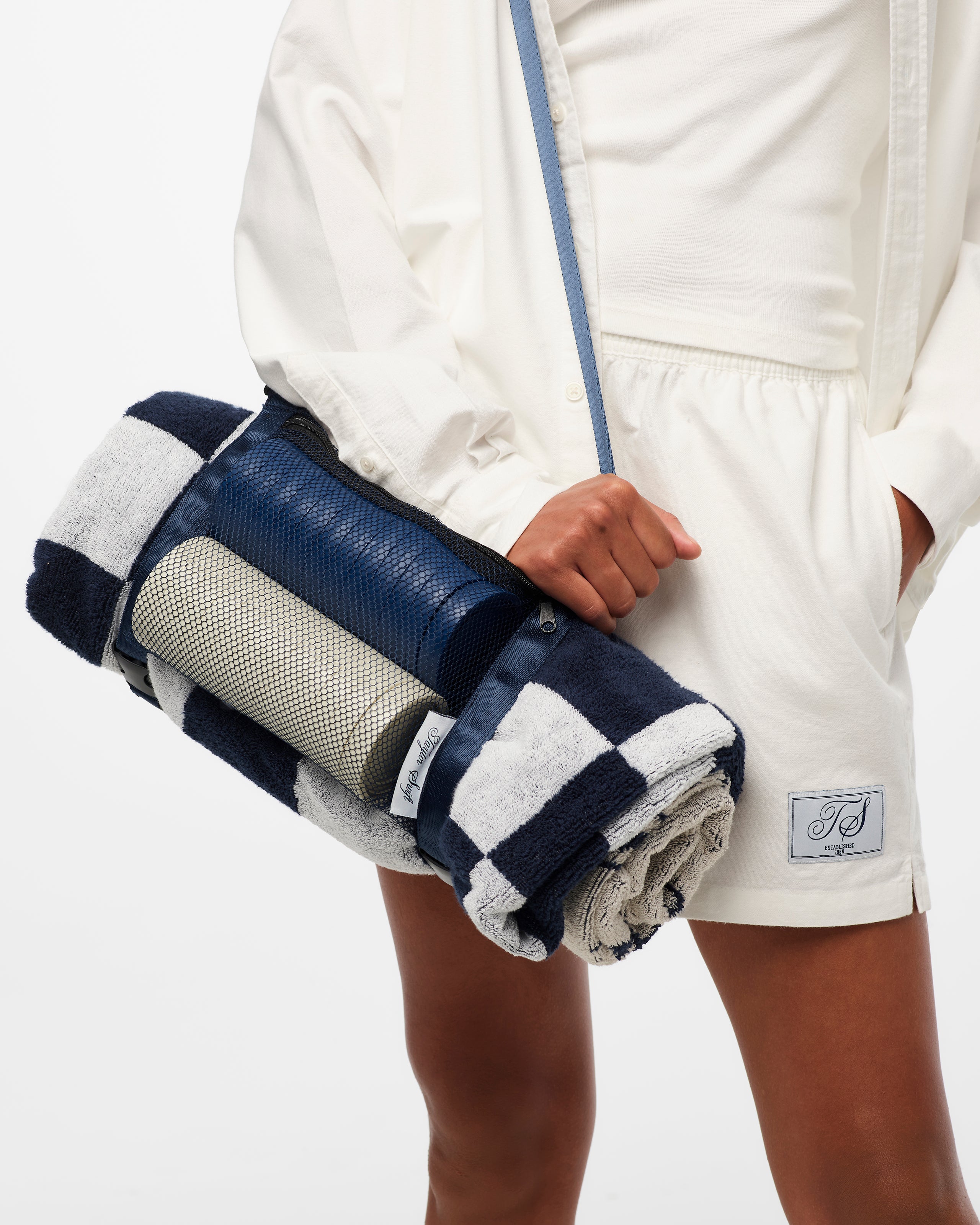 Taylor Swift Towel Game Set featuring TS Established 1989 crest logo. Taylor Swift. You Play Stupid Games You Win Stupid Prizes song lyrics. Established 1989 and checkerboard design woven on front. Features 24 custom 3 navy and cream plastic embossed checkers with TS established 1989 crest logo packaged in a navy strap with netting bag featuring Taylor Swift woven label.