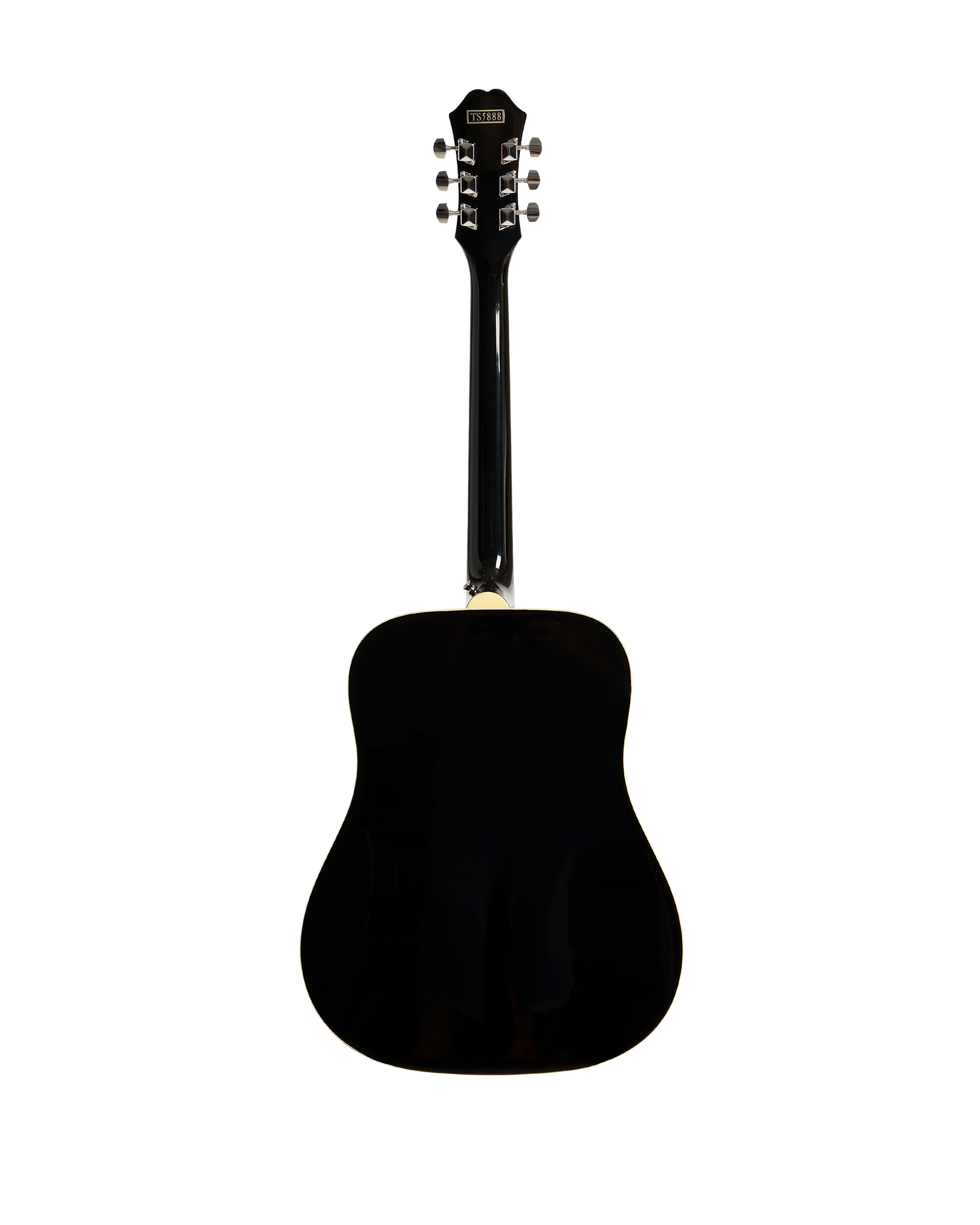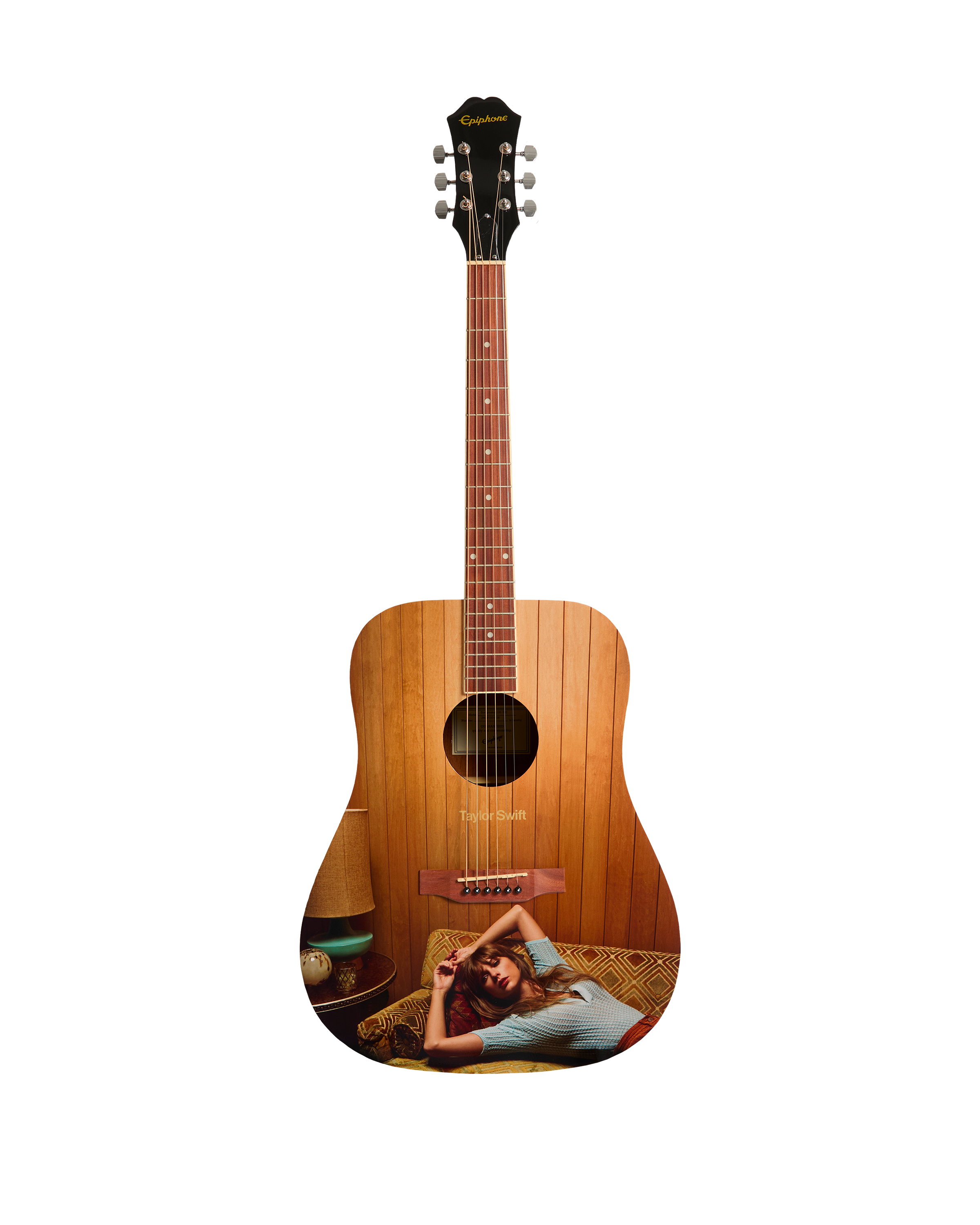 Acoustic Epiphone DR-100 guitar with Taylor Swift Midnights photo printed on front and Taylor Swift printed in center. Each guitar comes with a unique serial number printed on the back of the guitar headstock to identify this collectible product.