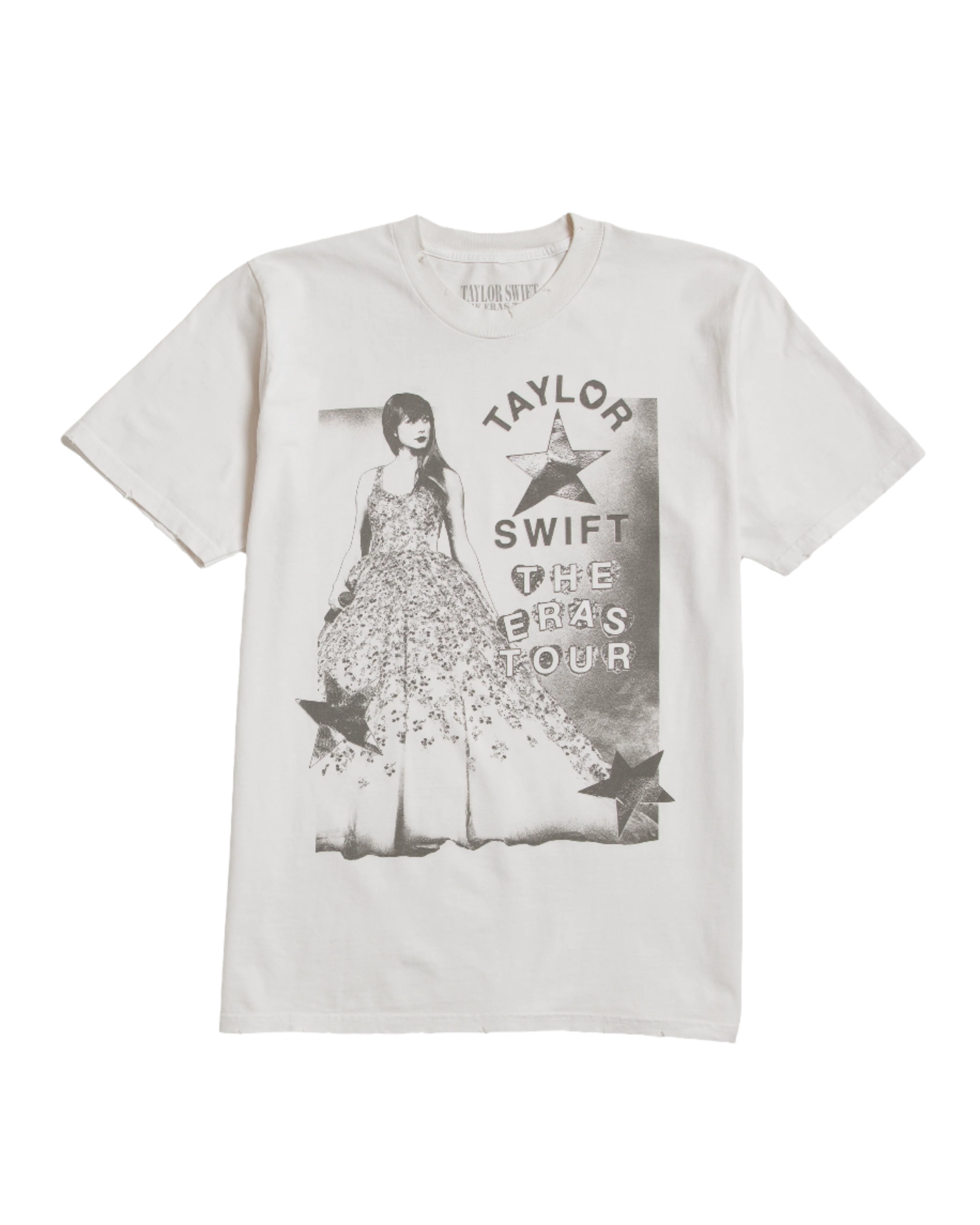 Beige oversized t-shirt featuring photo of Taylor Swift. star design. and Taylor Swift | The Eras Tour printed on front with Taylor Swift | The Eras Tour. tour locations. and heart design printed on back.