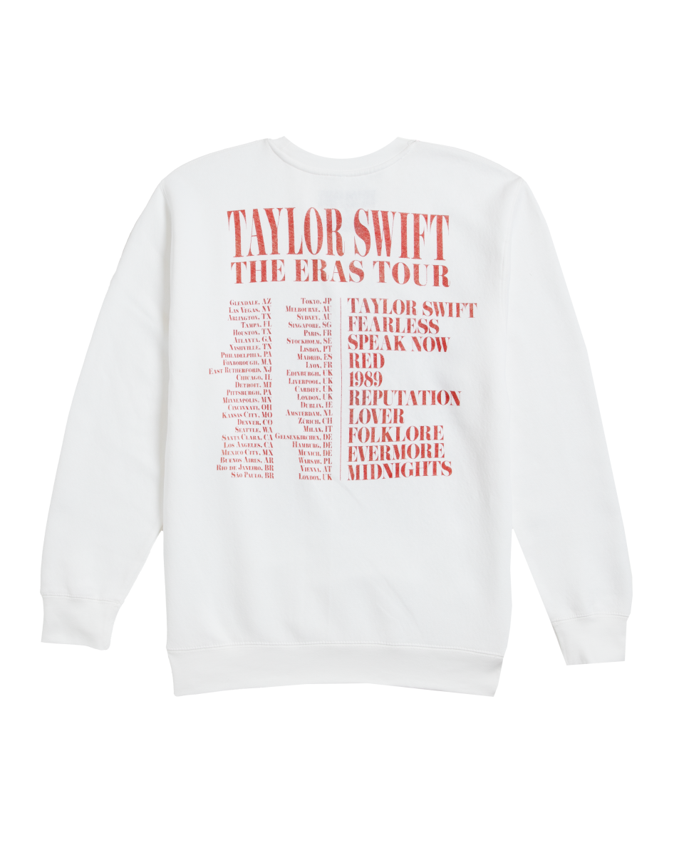 Pink t-shirt featuring photos of Taylor Swift and Taylor Swift The Eras Tour printed on front and Taylor Swift The Eras Tour 2023-2024 and tour locations printed on back.