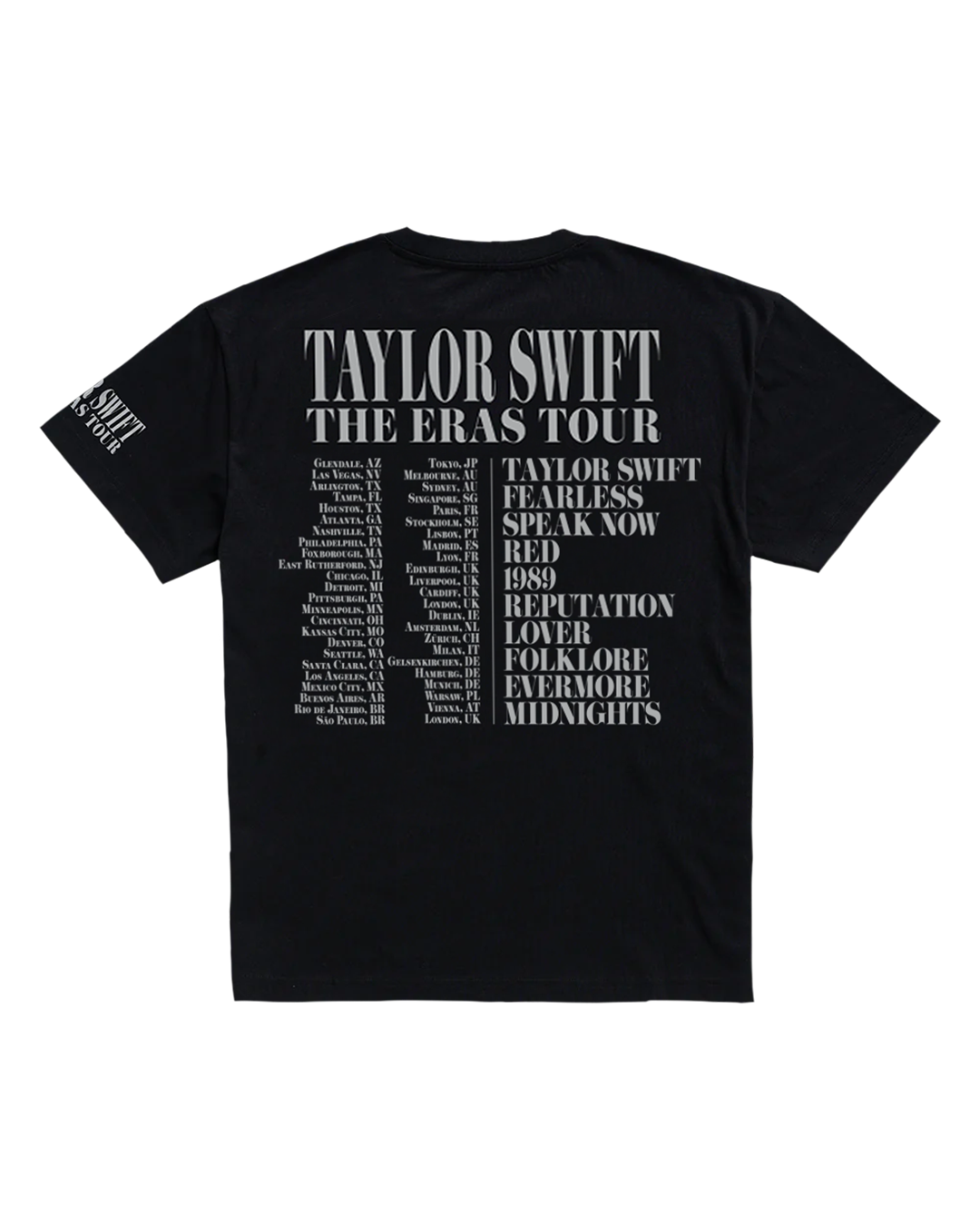 Black t-shirt featuring photos of Taylor Swift printed on front and Taylor Swift | The Eras Tour printed on wearer’s left sleeve with Taylor Swift | The Eras Tour. U.S. and international tour locations. and Taylor Swift album titles printed on back.