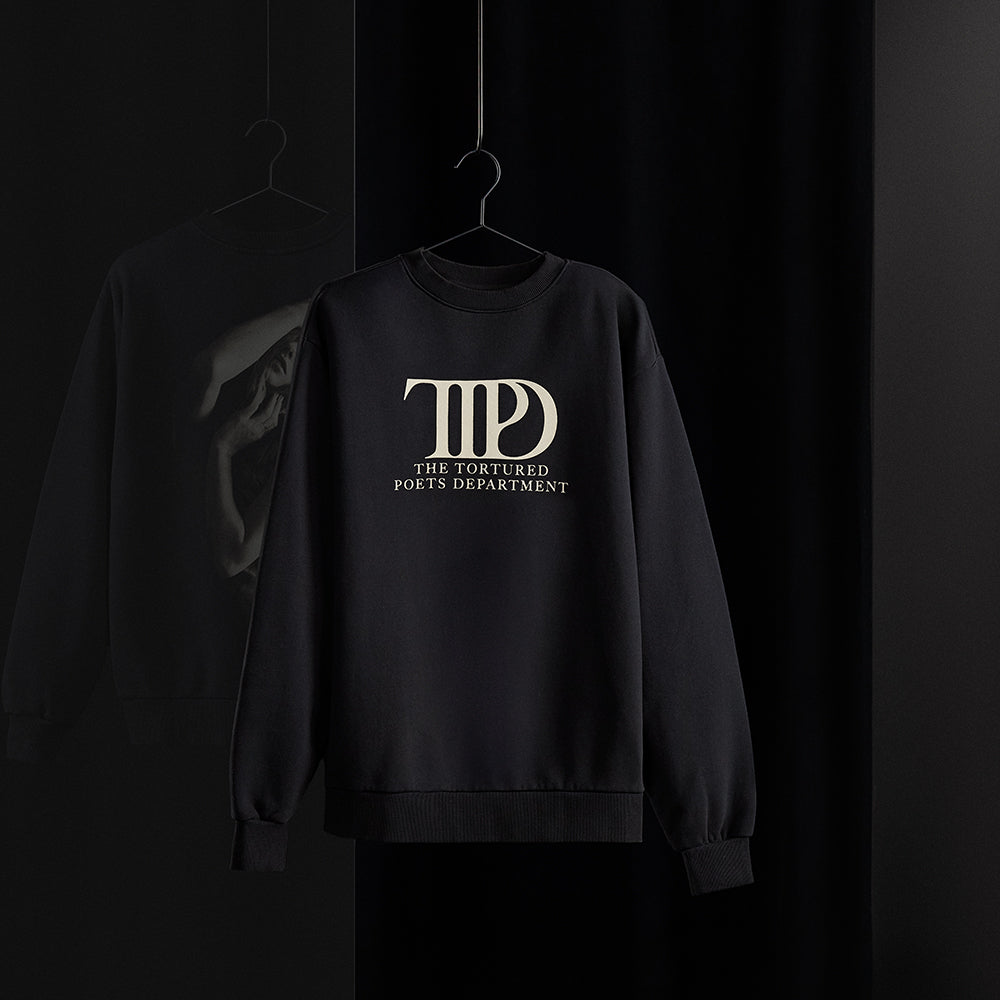 Ink black crewneck featuring gray TTPD album logo and The Tortured Poets Department printed on front and photo of Taylor Swift printed on back.