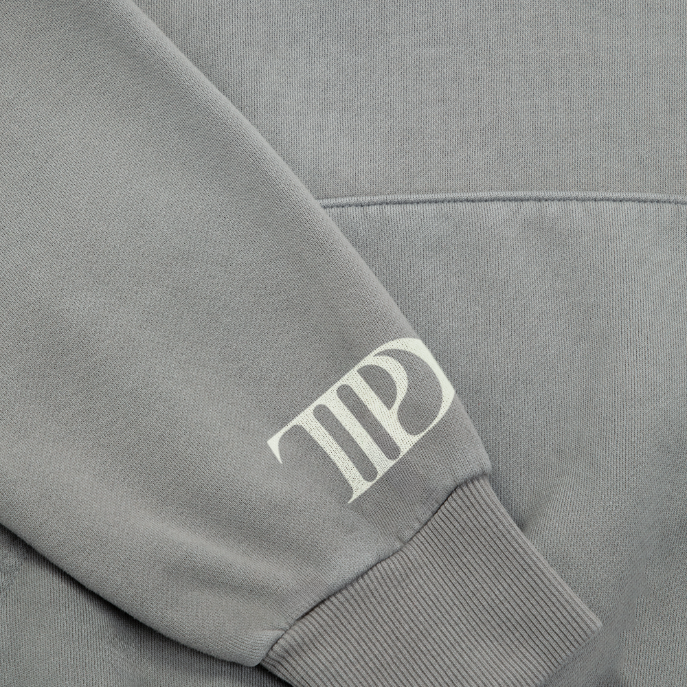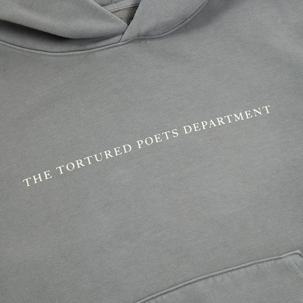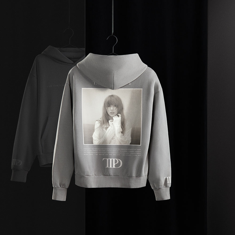 Smoke gray hoodie with front pocket featuring The Tortured Poets Department printed on front. TTPD album logo printed on wearer’s right sleeve. and photo of Taylor Swift. album tracklist. TTPD album logo and Taylor Swift printed on back.